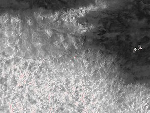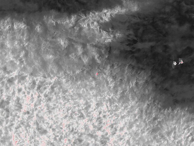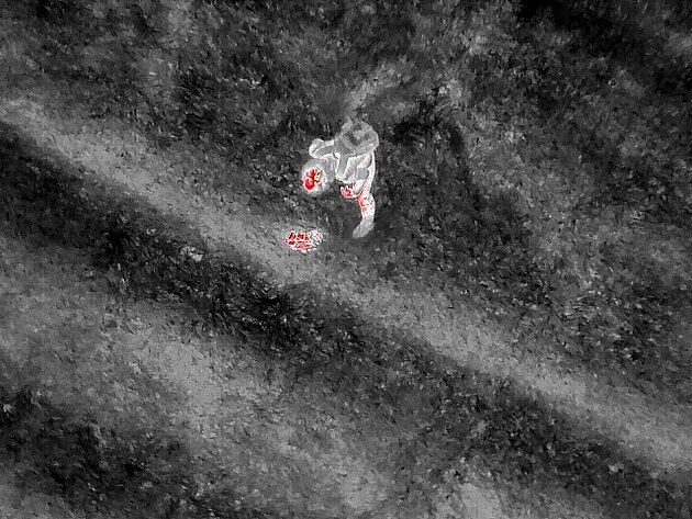 Das Bild der Wärmebildkamera wird vom Spotter auf dem Monitor konzentriert beobachtet. Ein warmer Körper erscheint meistens weiss auf dem graumarmorierten Untergrund, bei größeren Tieren oder geringerem Abstand der Drohne zum Boden auch rot.