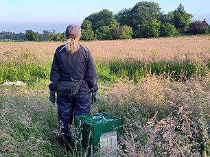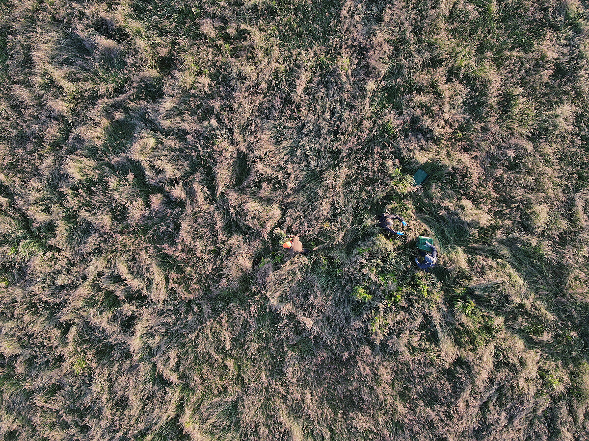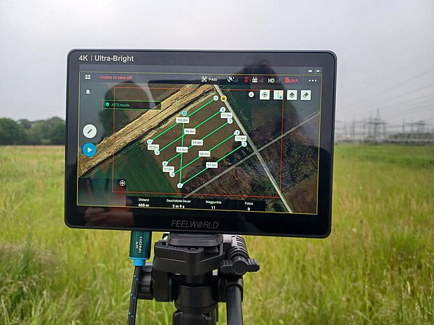 Die Felder, die wir absuchen, werden in eine spezielle Software eingetragen, die anhand der angegebenen Flughöhe und der technischen Eigenschaften der Kamera die Bahnen berechnet, die die Drohne fliegen muss, um das Feld abzudecken. Wenn die Drohne gestartet ist, fliegt sie automatisch diesen vorprogrammierten Kurs.
