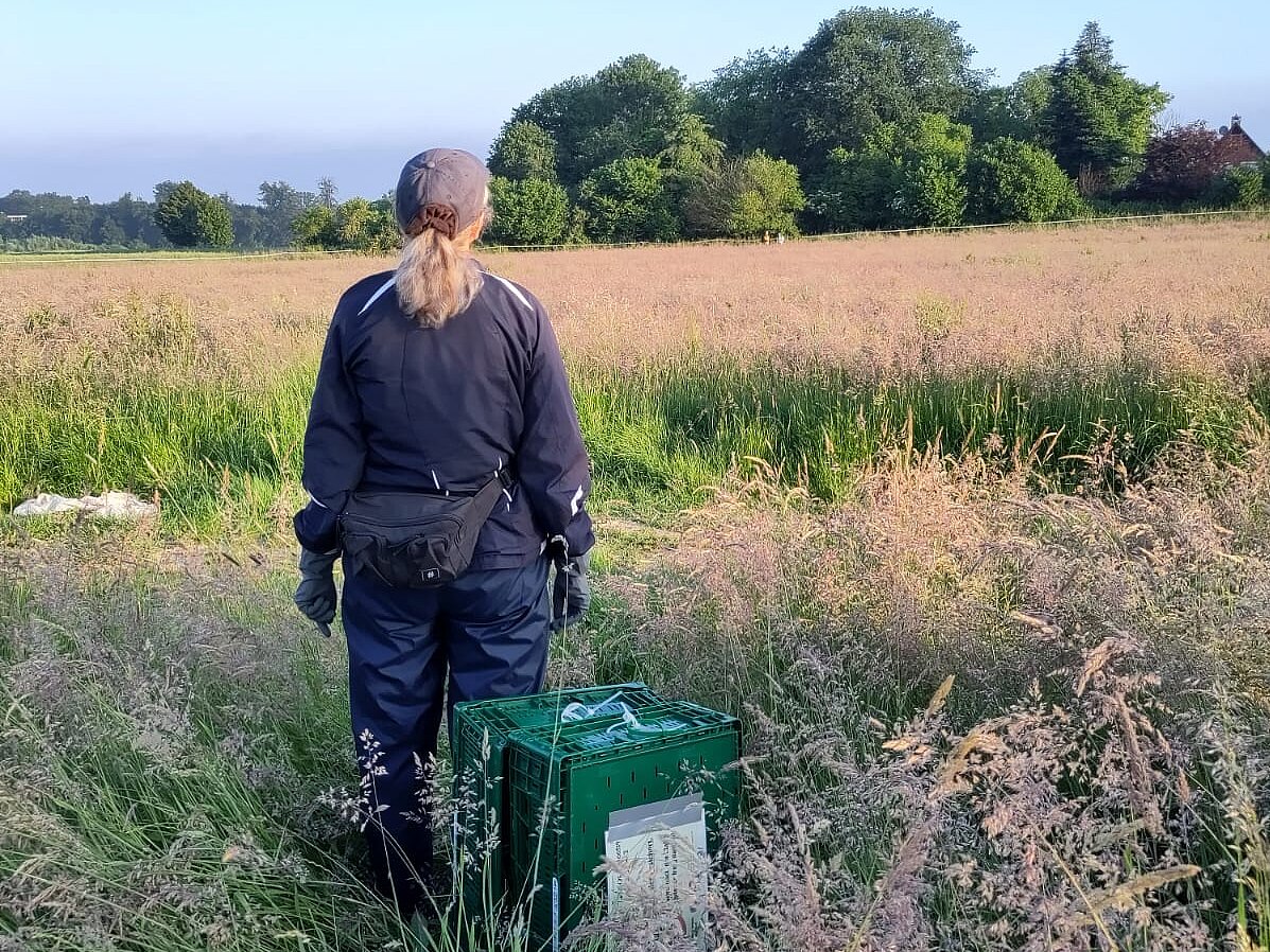 Erkennen wir schon über das Drohnenbild, dass es sich um einen Hasen handelt (erwachsene Hasen haben etwa die gleiche Größe wie ein Kitz), geben wir über Funk "Entwarnung" an die Läufer-Teams, da ein Hase so schnell flüchtet, dass wir ihn gar nicht einfangen können. Erkennen wir ein Kitz oder können es nicht eindeutig identifizieren, wird das Läufer-Team, das der Stelle am nächsten steht, über Funk dorthin geleitet. Die Drohne bleibt über der Fundstelle stehen, so dass der Spotter sehen kann, wenn die Läufer sich dem Tier nähern. Da die Läufer im hohen Gras nicht sehen können, wo genau das Tier liegt, muss der Spotter sie auf den letzten Metern punktgenau dorthin lotsen.