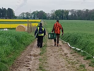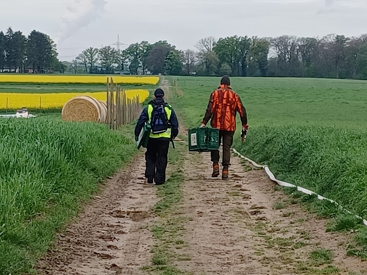 2 bis 3 Läufer-Teams, bestehend aus jeweils 2 Personen, verteilen sich an den Rändern um das Feld. Sie nehmen Kisten mit, in denen gefundene Kitze gesichert und am Rand des Feldes im Schatten unter Bäumen oder Büschen abgestellt werden können, bis das Feld gemäht worden ist. Alle Teams sind mit Funkgeräten ausgestattet.