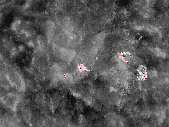 Sobald eine Stelle im Kamerabild erscheint, die ein junges Tier sein könnte, wird die Drohne von uns gestoppt, zum Verdachtspunkt navigiert und abgesenkt, um die Stelle zunächst aus der Luft näher zu untersuchen. Es kann sich außer einem Tier auch um einen Erdbrocken handeln, der wärmer als das umgebende Gras ist, oder ein großes Pflanzenblatt, das bereits von der Sonne erwärmt wurde. Färbt sich ein weisser Fleck beim Näherkommen rot, ist es wahrscheinlich ein Tier. Allerdings können auch frisch verlassene Liegeflächen von Rehen noch so viel Wärme ausstrahlen, dass sie rot erscheinen.